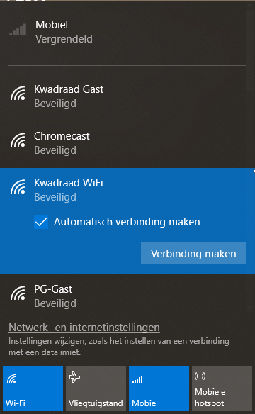 Je kiest voor Kwadraad WiFi en klikt daar op ‘verbinding maken’: