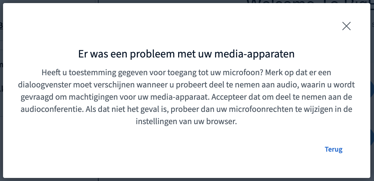 Nadat je bent ingelogd probeer je de microfoon te activeren. Dit lukt niet, en rechtsboven zie je (kort) dit verschijnen:
